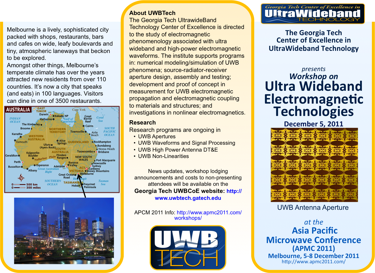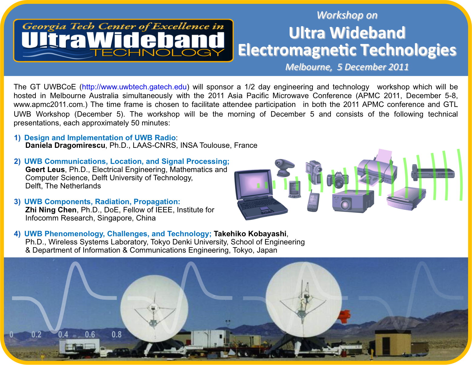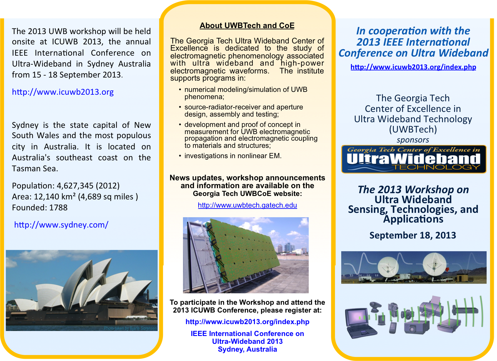 In cooperation with IEEE 2013 ICUWB in Sydney Australia, UWBTech sponsored a full day workshop on “ Ultra Wideband Sensing, Technologies, and Applications” in September 2013. The workshop consisted of 5 one hour presentations and one round robin discussion addressing the “Future of UWB”. Workshop details are found on the UWB Workshops and Database website. Use the Contact Us to request Database Access.